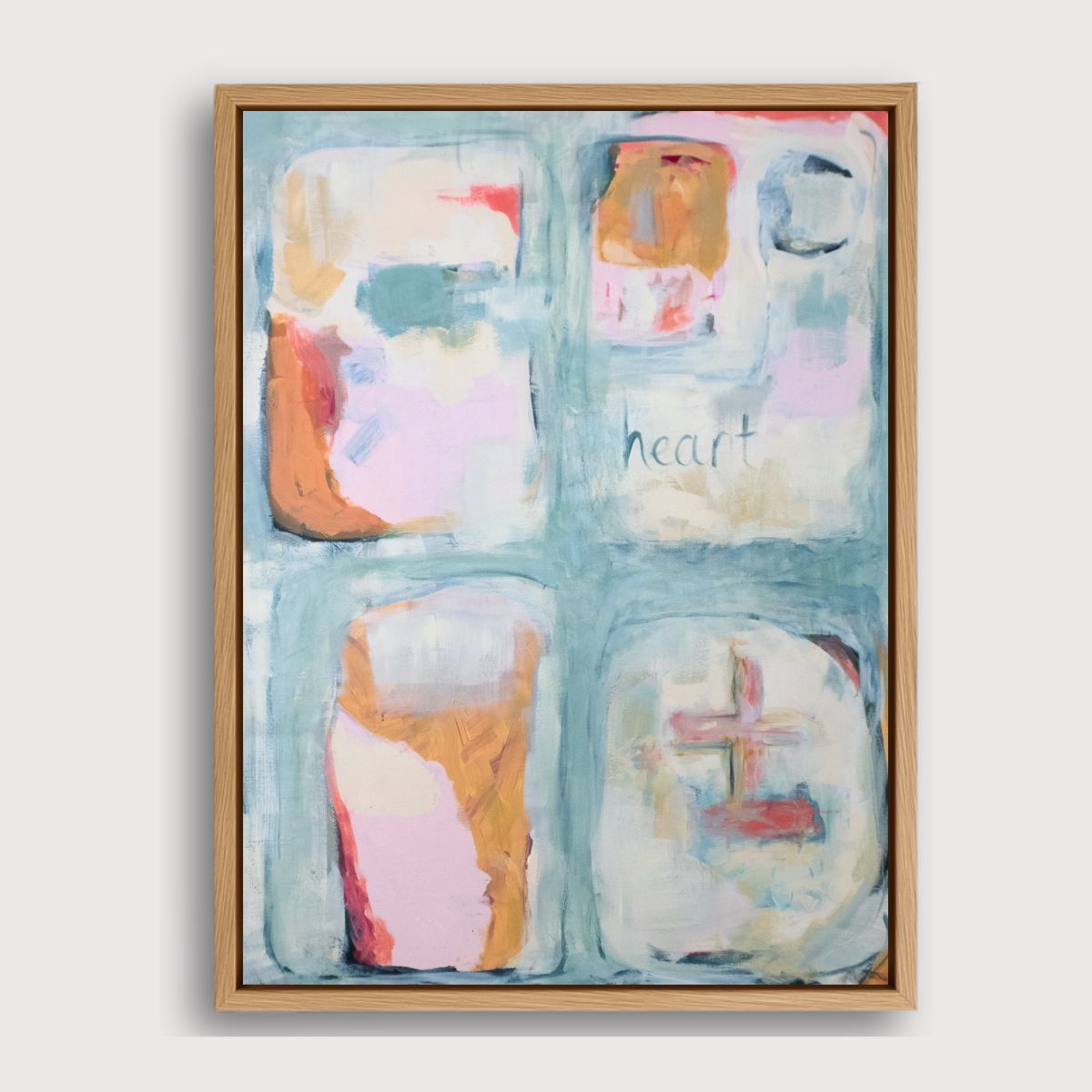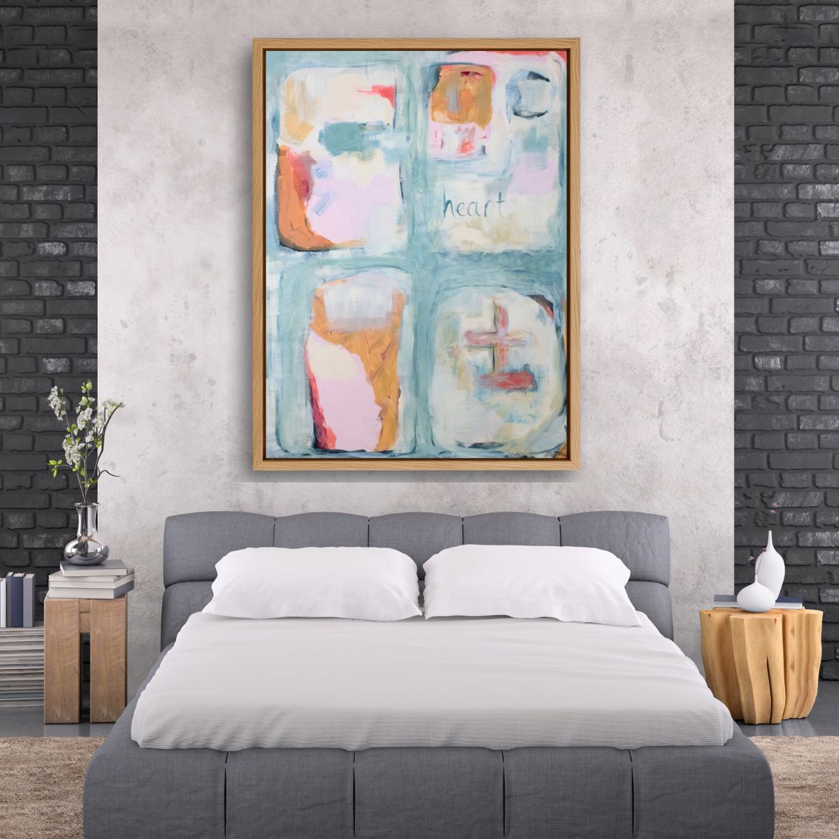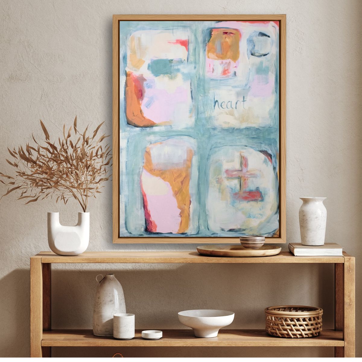 Discover the poetry of emotion in "Four Corners of my Heart." Soft pastels and abstract shapes symbolize the many chambers where feelings dwell - each block inviting reflection on love, vulnerability, and memory. The subtle handwritten word "heart" bridges these compartments, making this artwork a soulful piece for any thoughtful space.