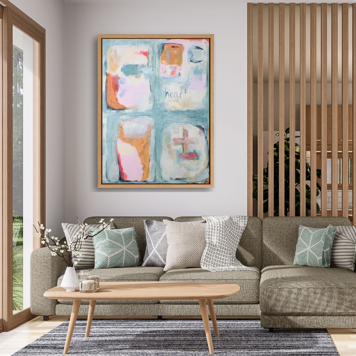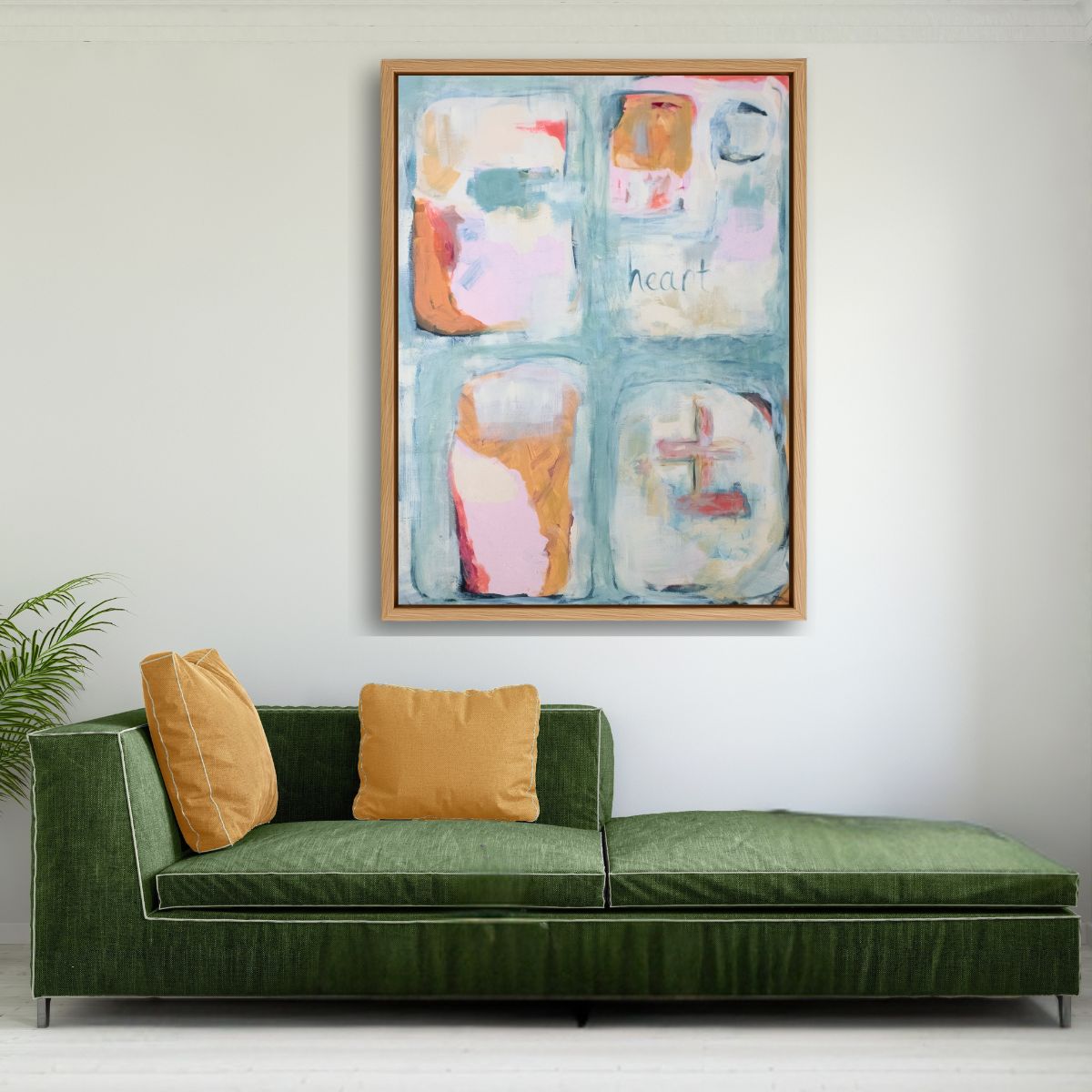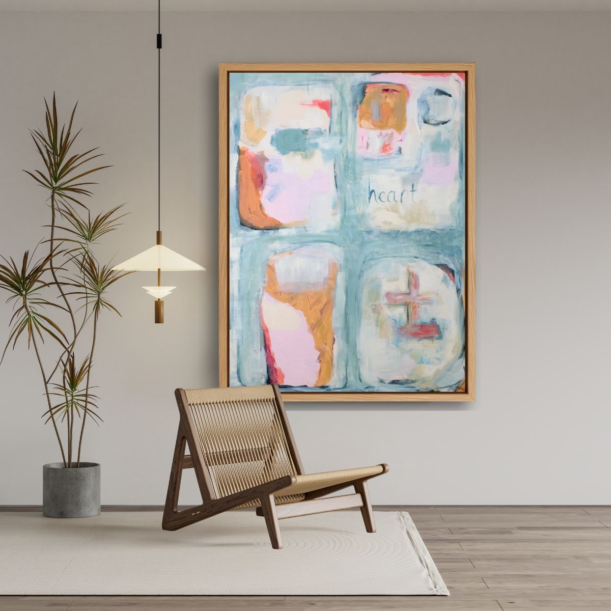 Discover the poetry of emotion in "Four Corners of my Heart." Soft pastels and abstract shapes symbolize the many chambers where feelings dwell - each block inviting reflection on love, vulnerability, and memory. The subtle handwritten word "heart" bridges these compartments, making this artwork a soulful piece for any thoughtful space.