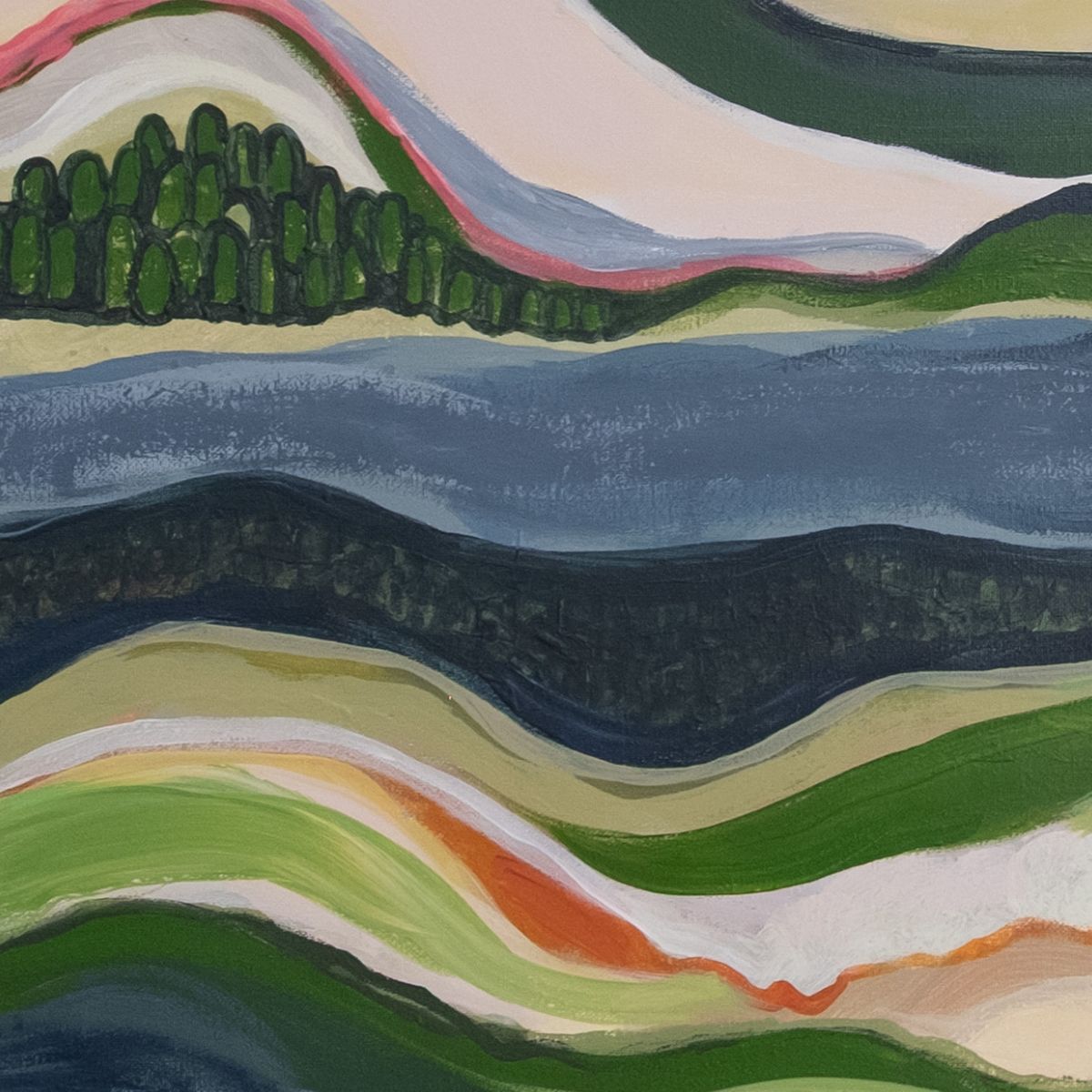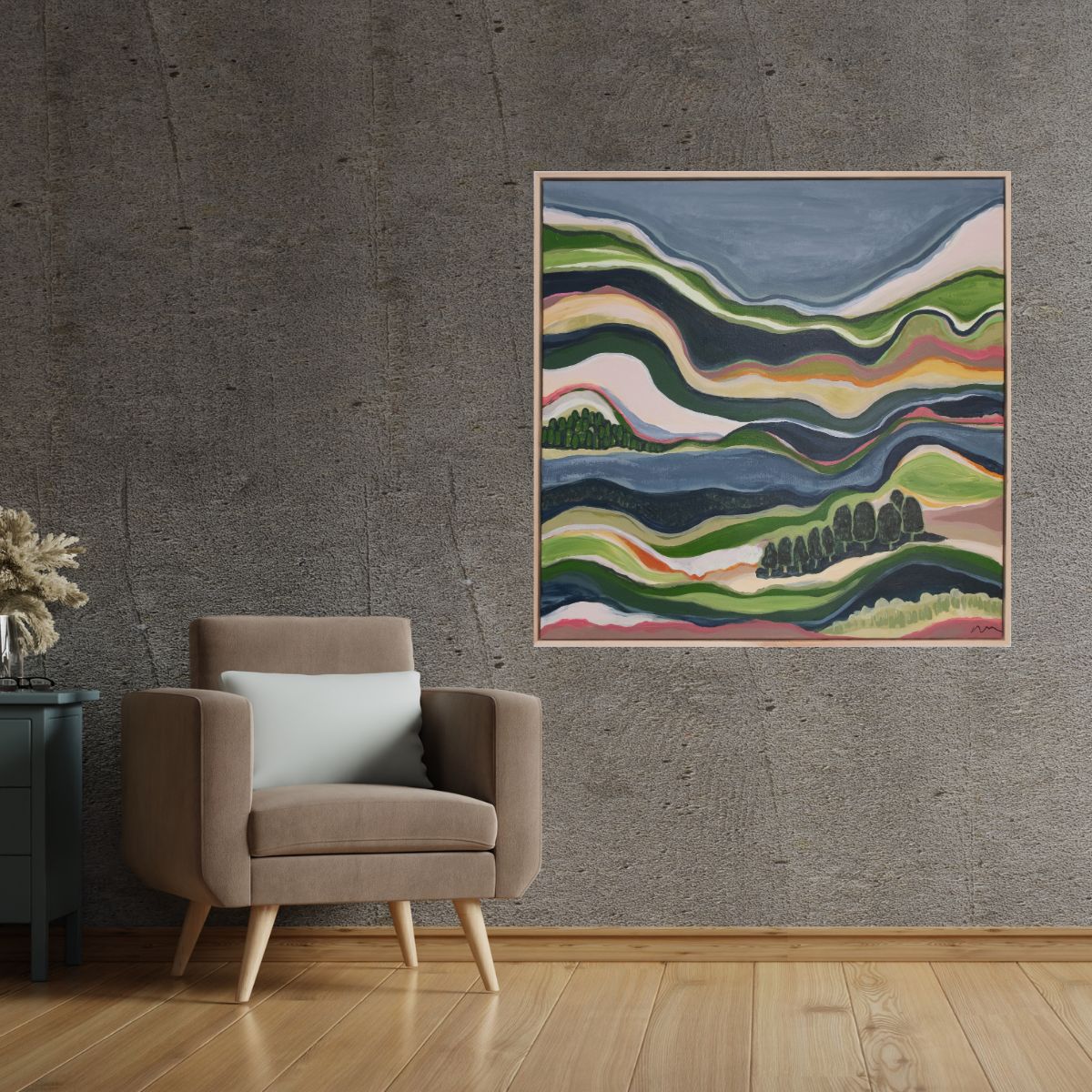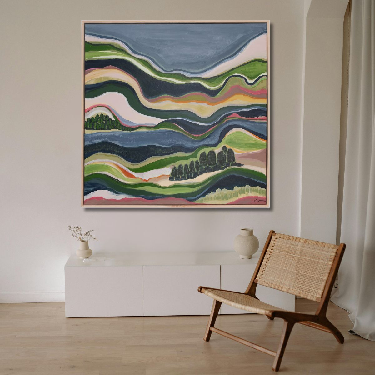 Hill Meets Sky is an evocative abstract artwork that celebrates the harmony between land, water and sky. Featuring undulating hills in rich tones of green, blue, pink, and yellow, the composition flows effortlessly into a dramatic sky of deep blues and soft whites. Layered textures and fluid lines create depth and movement, inviting the viewer to journey across this colourful landscape. Perfect for adding a sense of serenity and artistic flair to any space, this piece captures the beauty of nature in a bold, contemporary style.