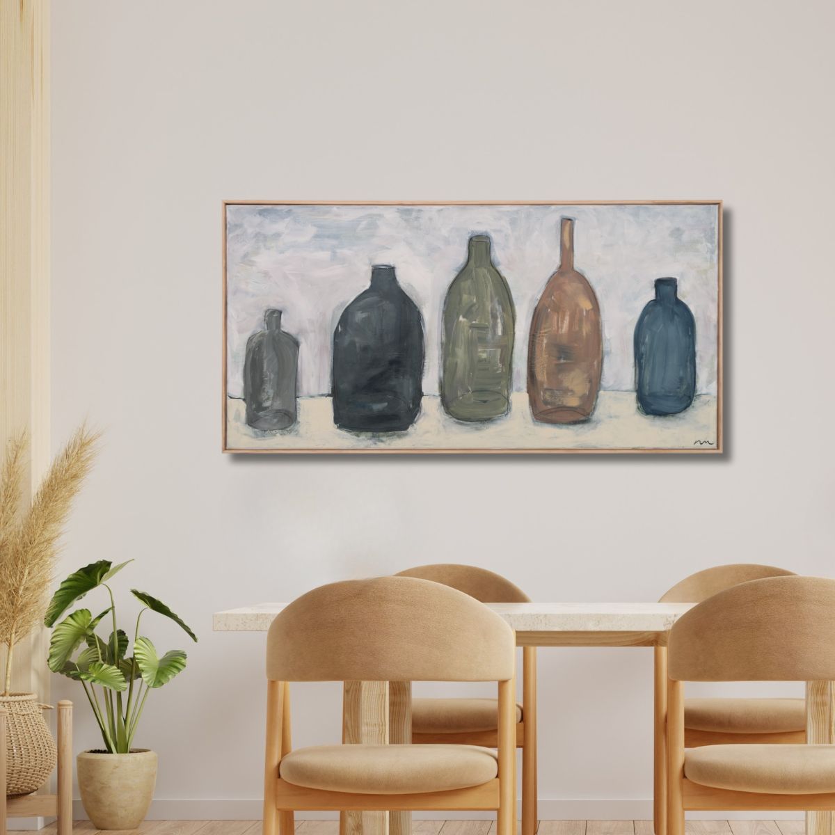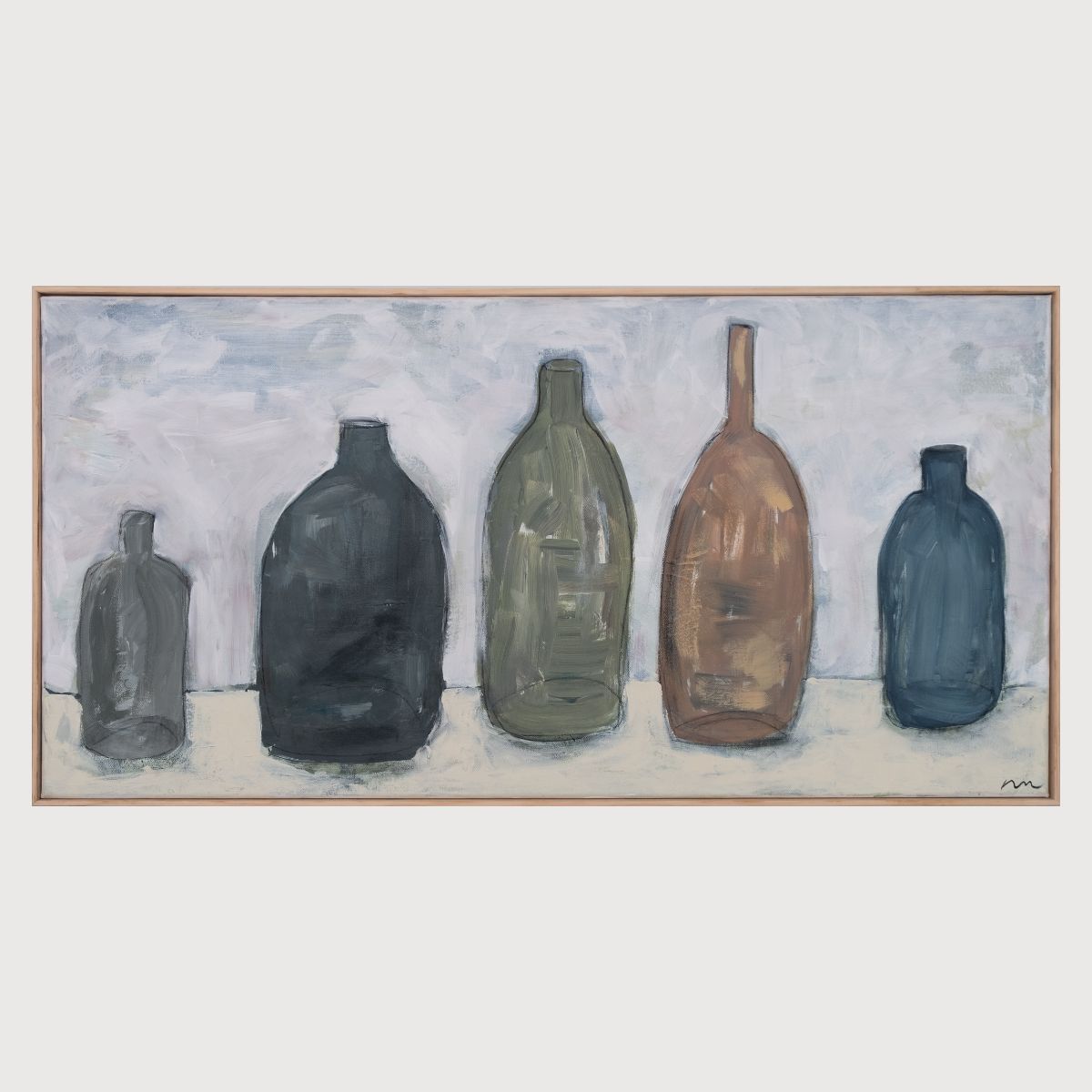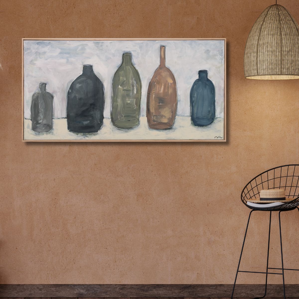 Evoking the quiet elegance of an Italian still life, ‘Le Bottiglie’ captures a nostalgic moment through the gentle interplay of form and hue. Standing in quiet harmony, the bottles earthy tones of olive green, terracotta, and charcoal are softened by a misty grey backdrop. The muted palette and minimalist composition echo the timeless charm of rustic Italian interiors, where simplicity and warmth speak volumes to the understated beauty of everyday objects.