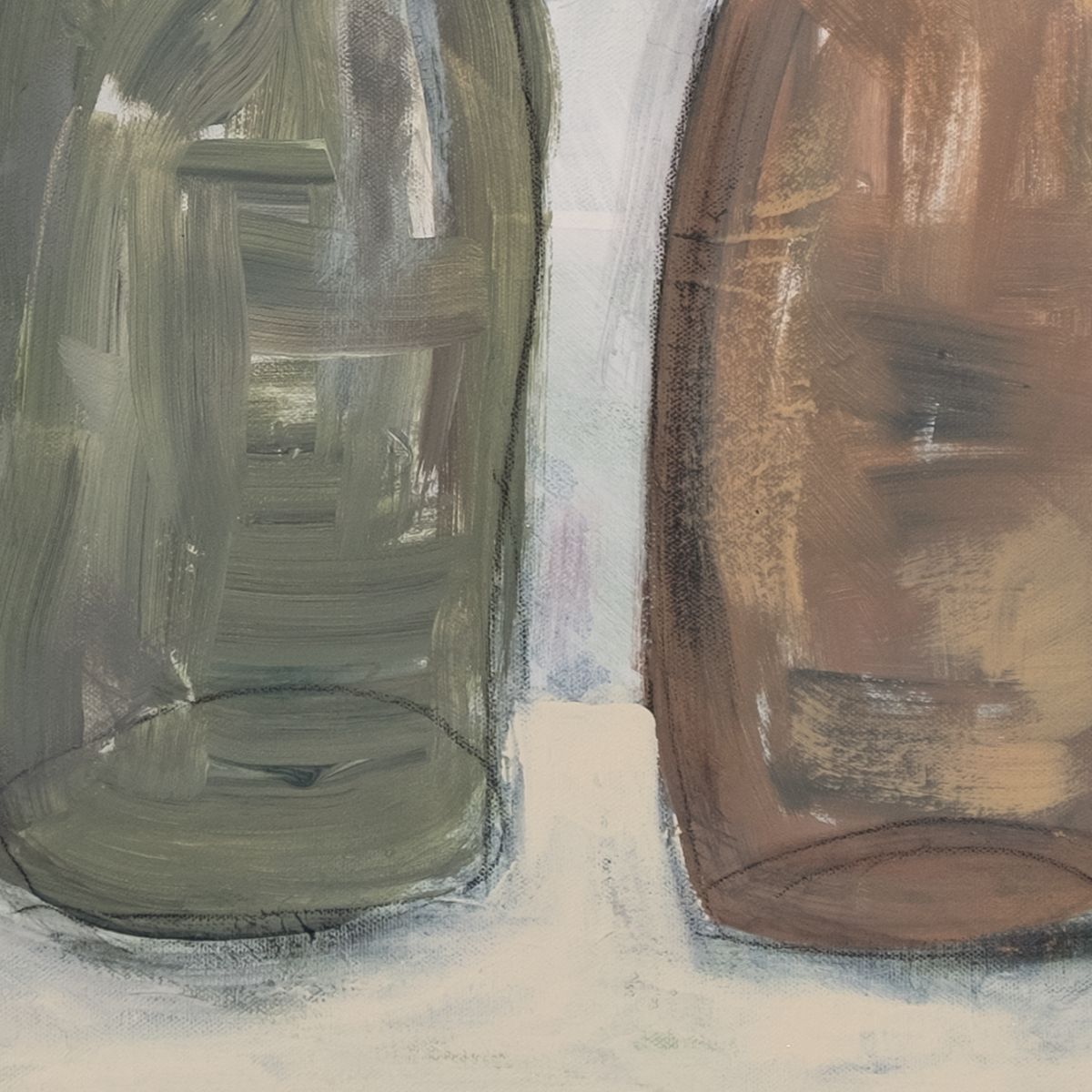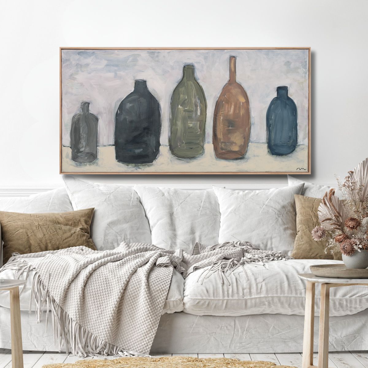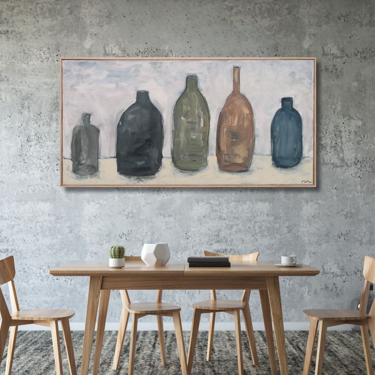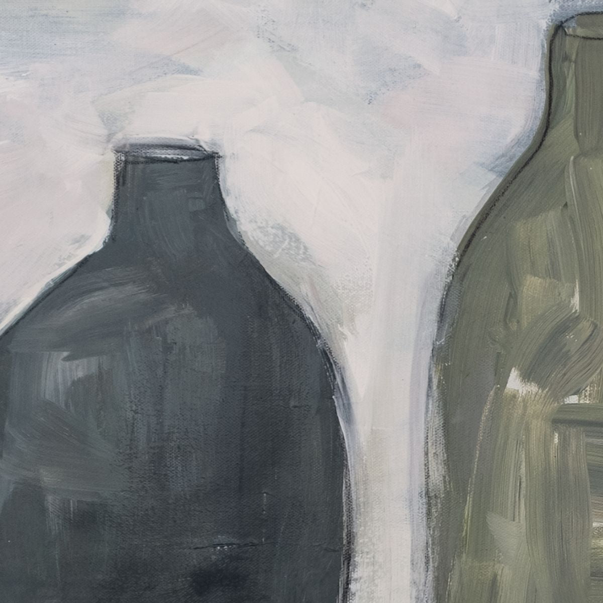 Evoking the quiet elegance of an Italian still life, ‘Le Bottiglie’ captures a nostalgic moment through the gentle interplay of form and hue. Standing in quiet harmony, the bottles earthy tones of olive green, terracotta, and charcoal are softened by a misty grey backdrop. The muted palette and minimalist composition echo the timeless charm of rustic Italian interiors, where simplicity and warmth speak volumes to the understated beauty of everyday objects.