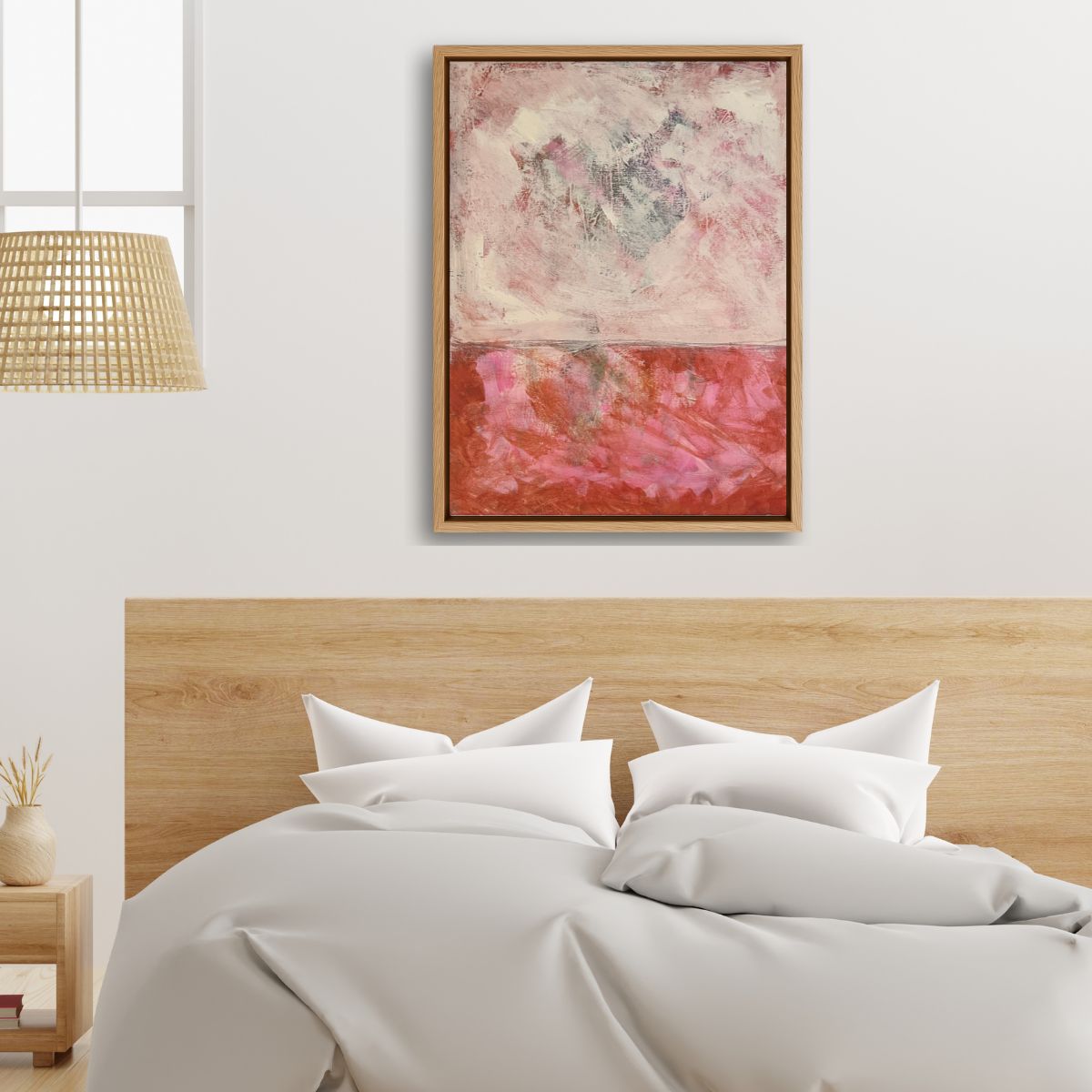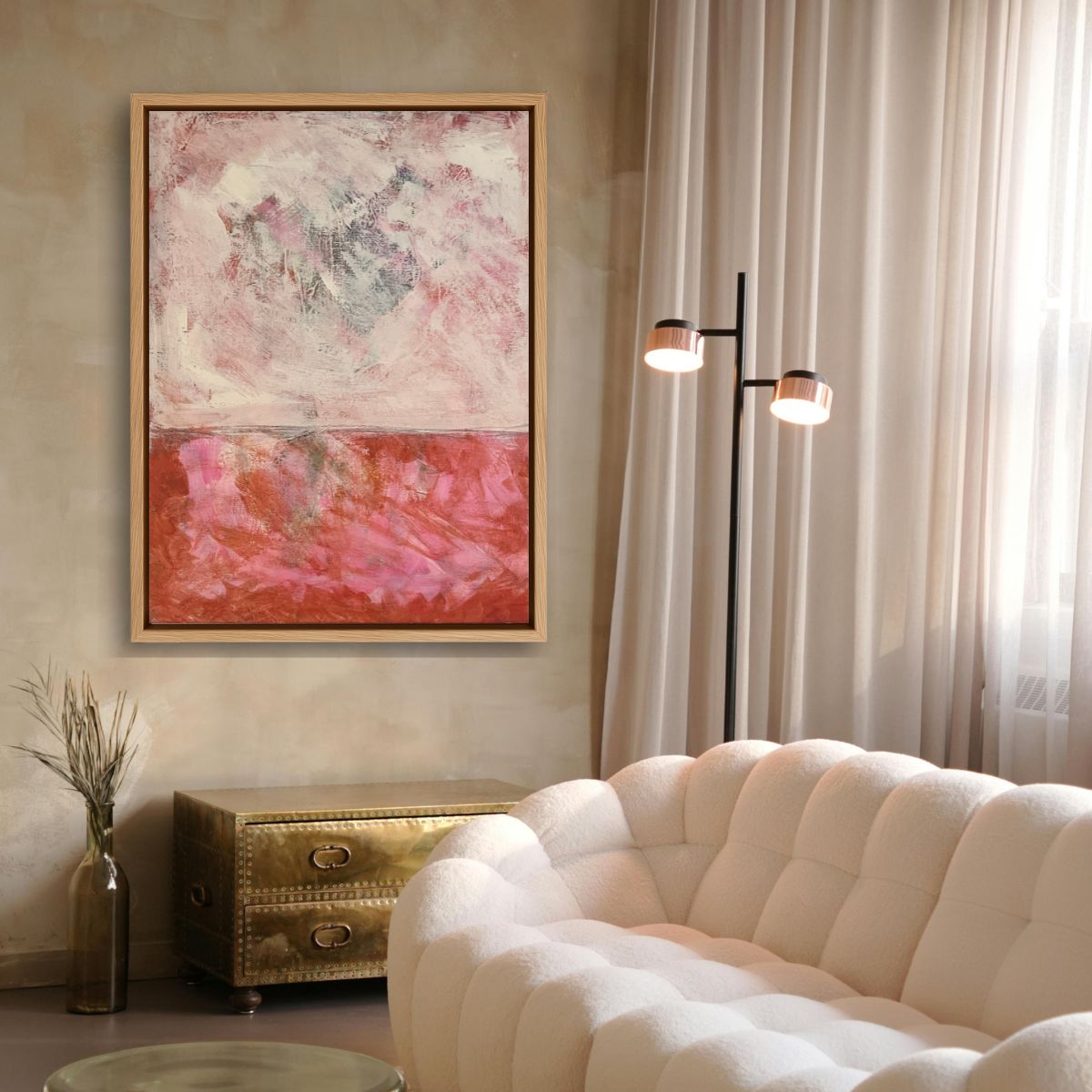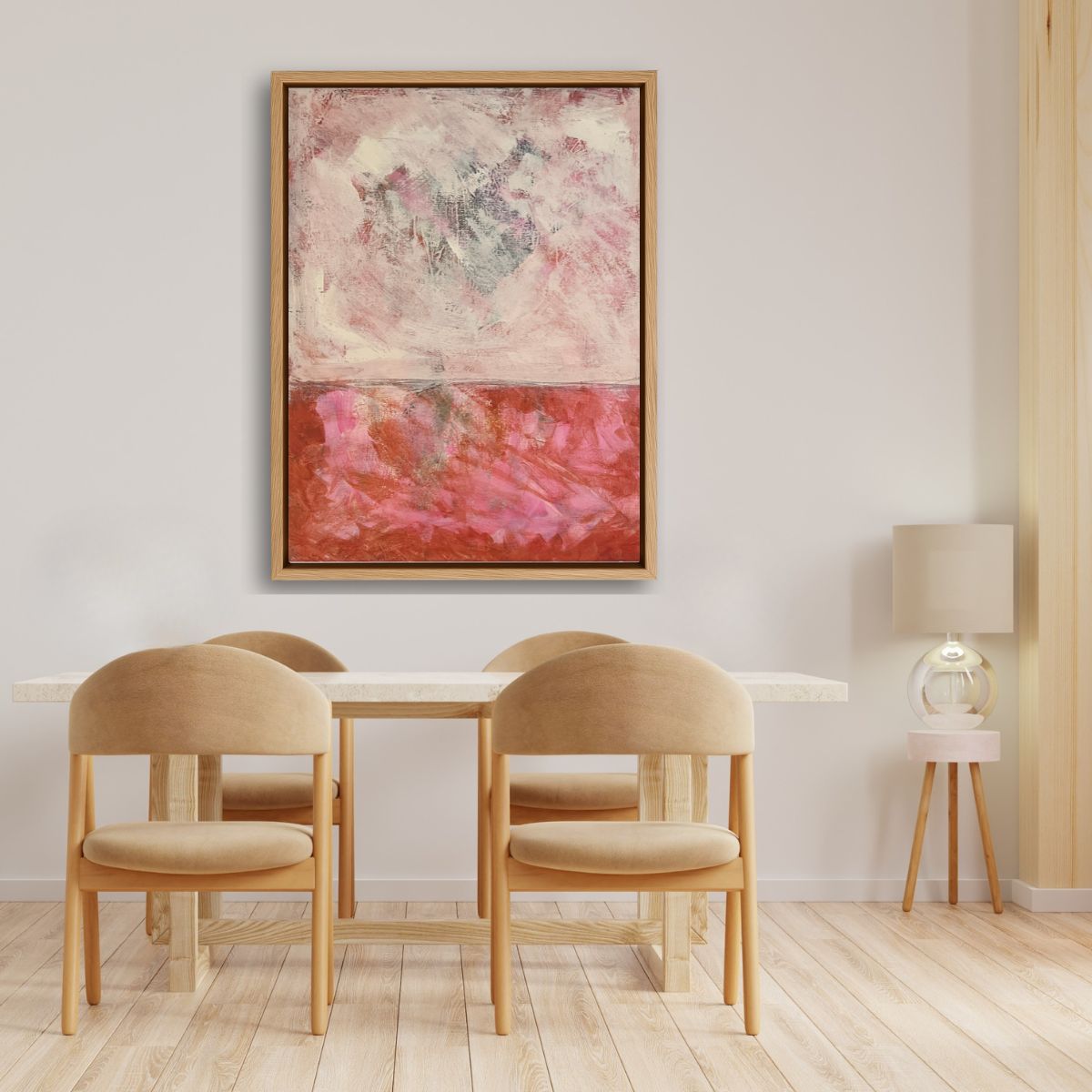 Pink Earth is an abstract landscape that evokes a serene yet grounded atmosphere. The upper half features soft pinks, whites, and subtle blues, resembling a soft sunset, while the lower half is rich with earthy reds and deeper pinks, suggesting terrain or soil.