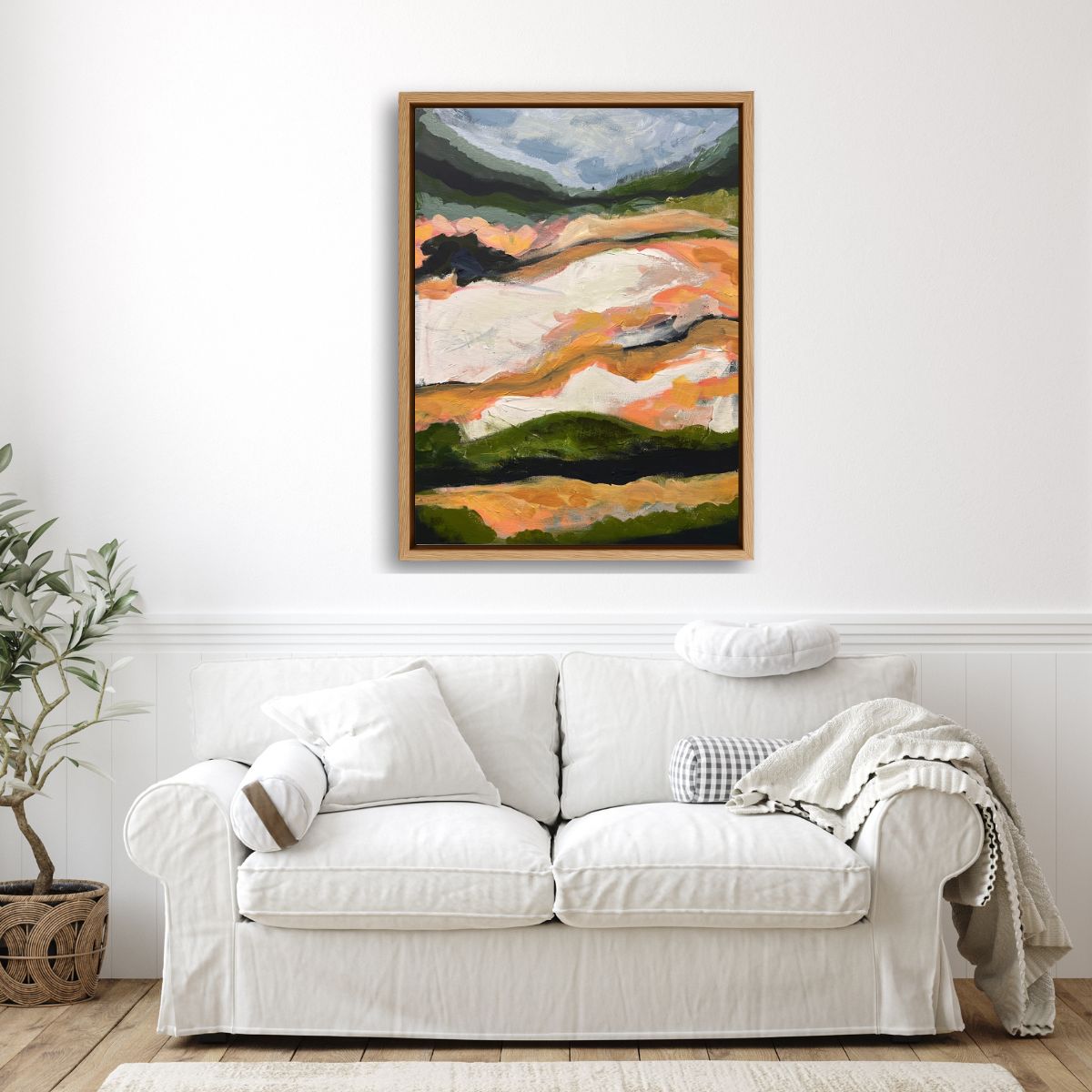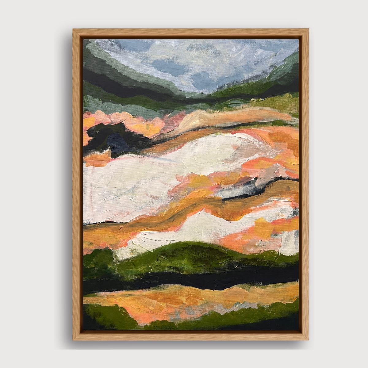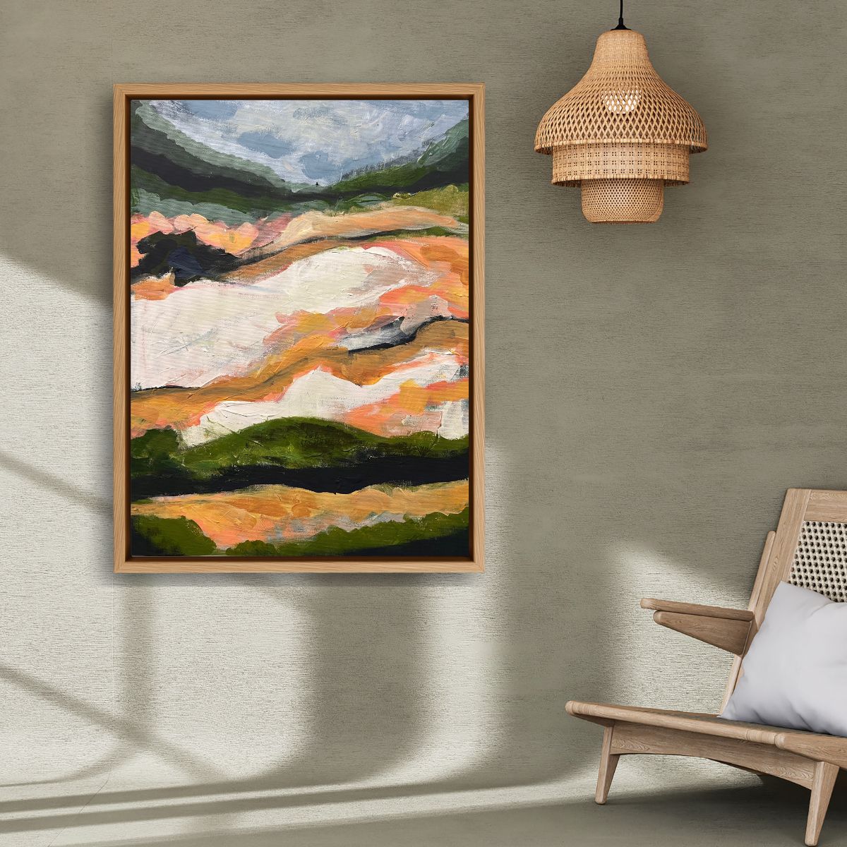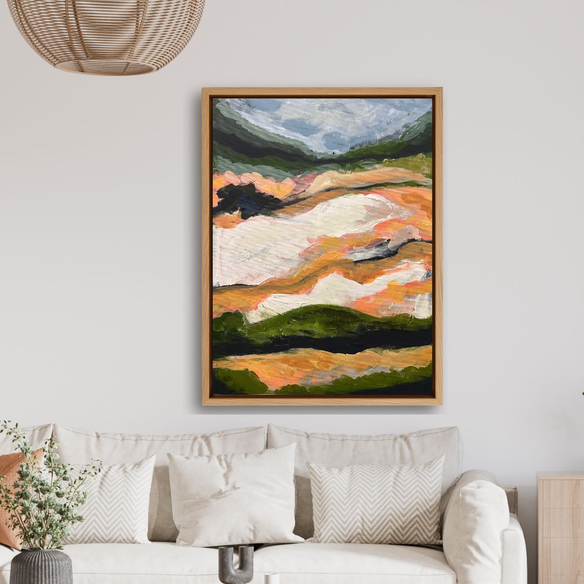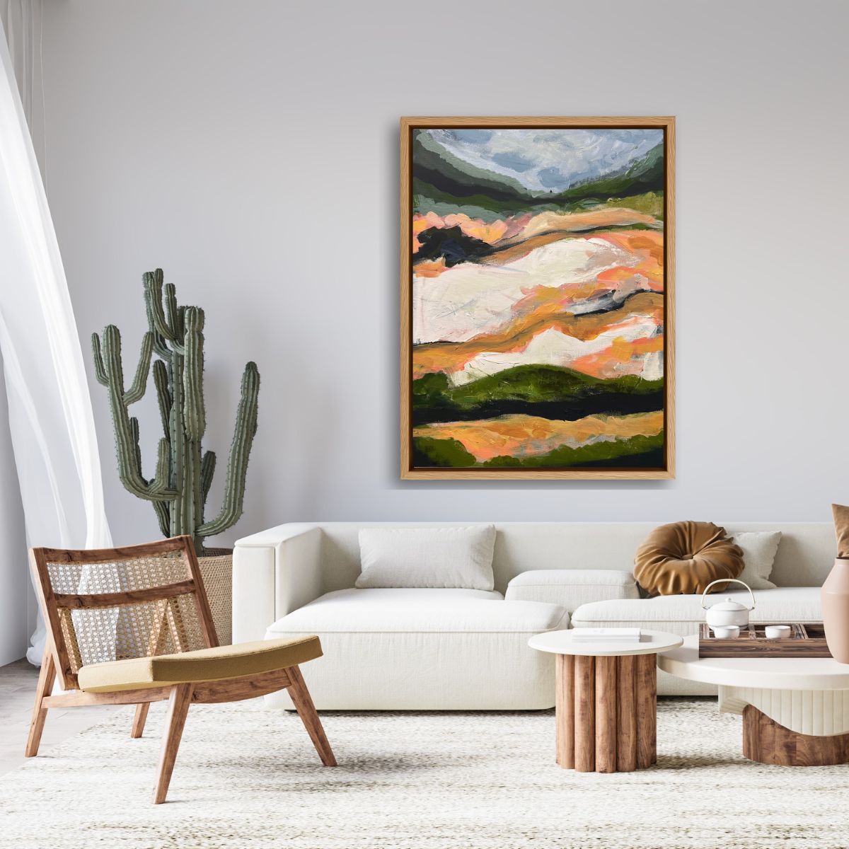 FRAMED: Stretched and beautifully framed in a natural wood Tasmanian Oak floater frame - ready to hang, no hardware or assembly needed