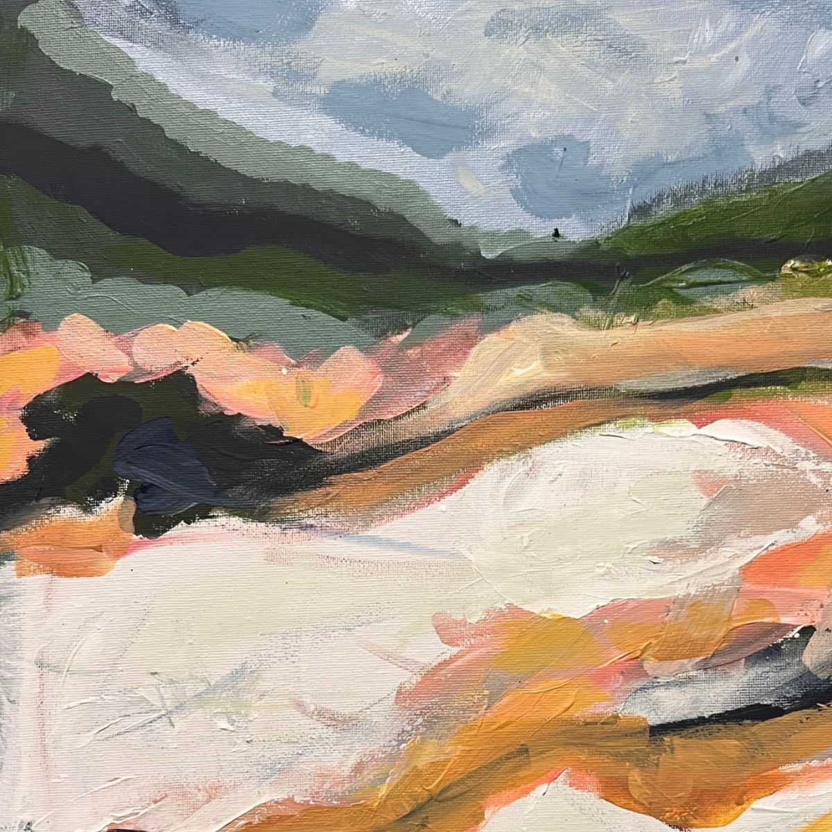 An abstract painting of Rainbow Earth, QLD, captures the serene landscape with warm tones, highlighting the golden sands, vibrant hues of the sunset, and the tranquil blue waters blending harmoniously.